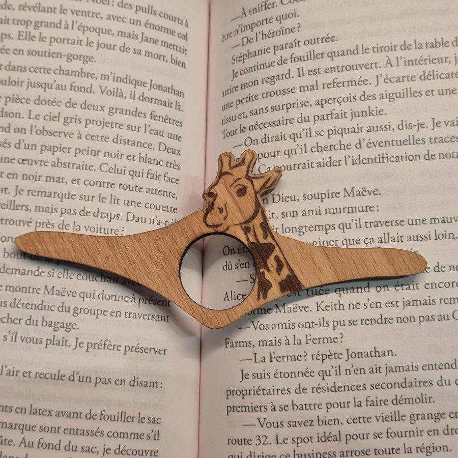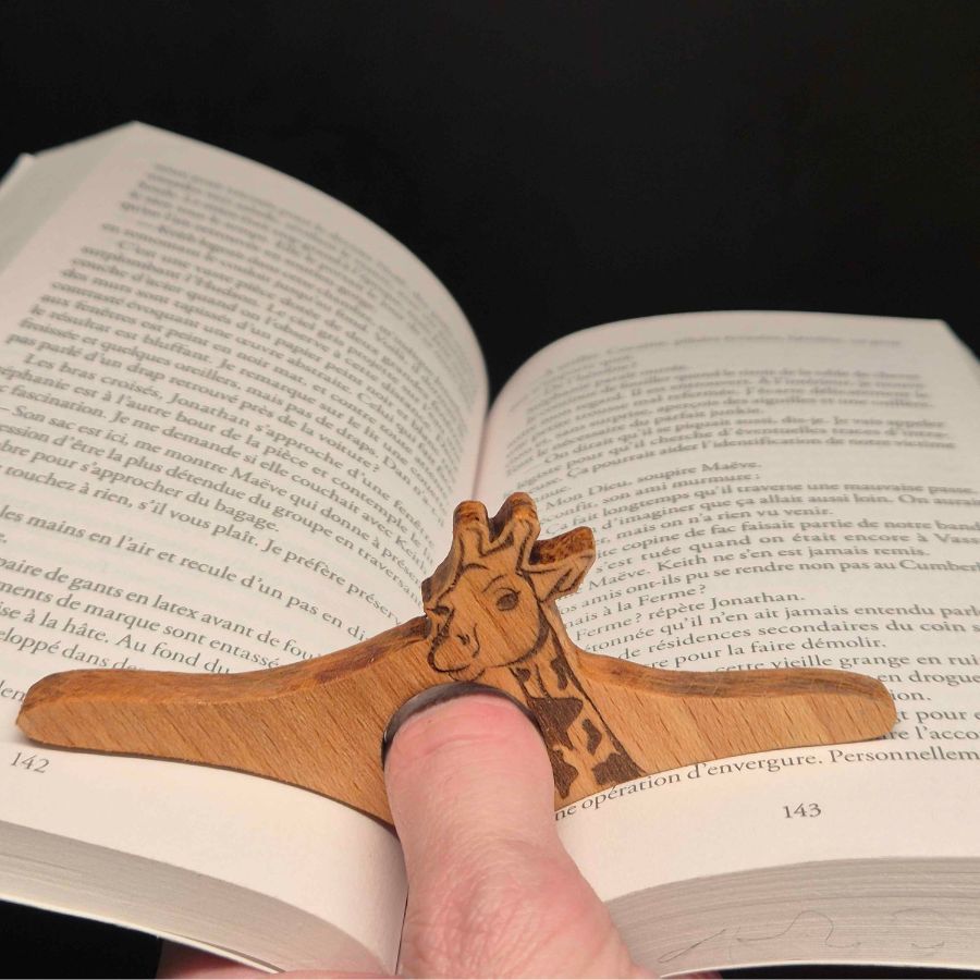 Créée pour maintenir l’ouverture du livre sans effort, cette bague de lecture offre une sensation de légèreté et de chaleur propre à la matière bois. Son bord soigneusement poncé se distingue par un toucher doux, presque textile, rappelant la délicatesse, et son silence naturel tranche avec celui des accessoires métalliques. Le motif girafe apporte personnalité et originalité tout en restant discret à l’œil, de sorte que l’illustration n’empiète pas sur le texte. Ce modèle artisanal, pensé dans notre atelier de Rouen, privilégie des matériaux durables et un design ergonomique, avec un trou de pouce adaptable afin d’assurer un confort constant, livre après livre. Grâce à ses finitions maîtrisées, il s’inscrit autant dans l’univers des bijoux en bois que dans celui de l’outil pratique de lecture.