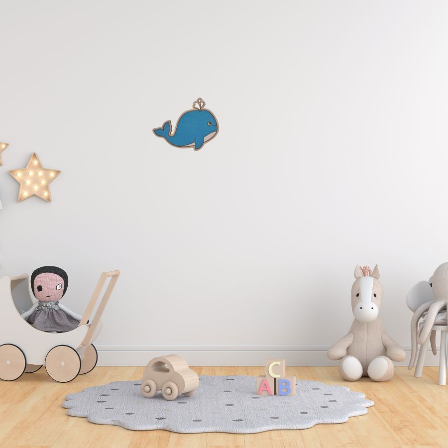 Pour jouer sur les volumes, placez une grande baleine au centre du mur et deux plus petites à côté, puis complétez avec un mobile composé d’animaux de l’océan ou d’un poisson. Le thème reste clair sans être chargé. Gardez un pan de mur libre pour respirer et choisissez une teinte dominante, bleu ou rose, selon votre envie. Cet accessoire en forme de baleine apporte une note douce et mignonne dans l’univers de bébé et aide à ancrer l’ambiance marine sans en faire trop.