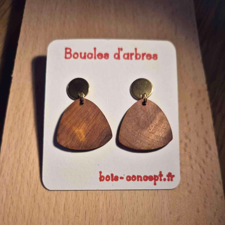 Découvrez nos boucles d’oreilles N°3, composées d’une forme triangulaire arrondie, aux lignes douces, réalisée en bois d’ébène, de thuya ou d’amarante, et associée à un clou rond en métal (Acier inoxydable).