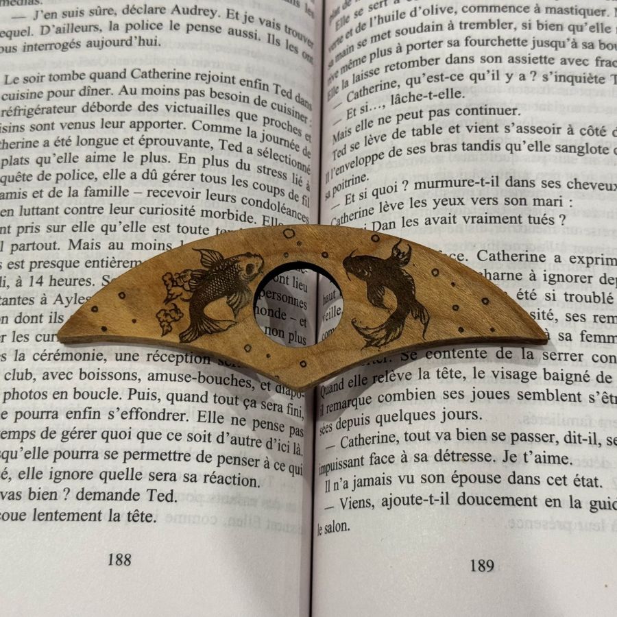 Cette bague de lecture artisanale « Carpe Koi » conjugue la sobriété du bois et un motif japonais finement gravé pour sublimer chaque moment de lecture. Entièrement façonnée en bois, elle se porte aisément sur le pouce et maintient la page sans effort. Le tracé précis, rendu possible par une technologie de gravure maîtrisée, souligne la silhouette du poisson mythique; le veinage naturel peut varier, rendant chaque pièce unique, dans l’esthétique carpe koi.
