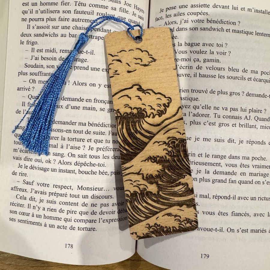 Ce marque-page japonais en bois s’inspire d’une vague déferlante, dans un style graphique rappelant les célèbres estampes japonaises attribuées à Hokusai. Le motif évoque le mouvement, la force de la nature et son équilibre permanent, tout en restant lisible et épuré.