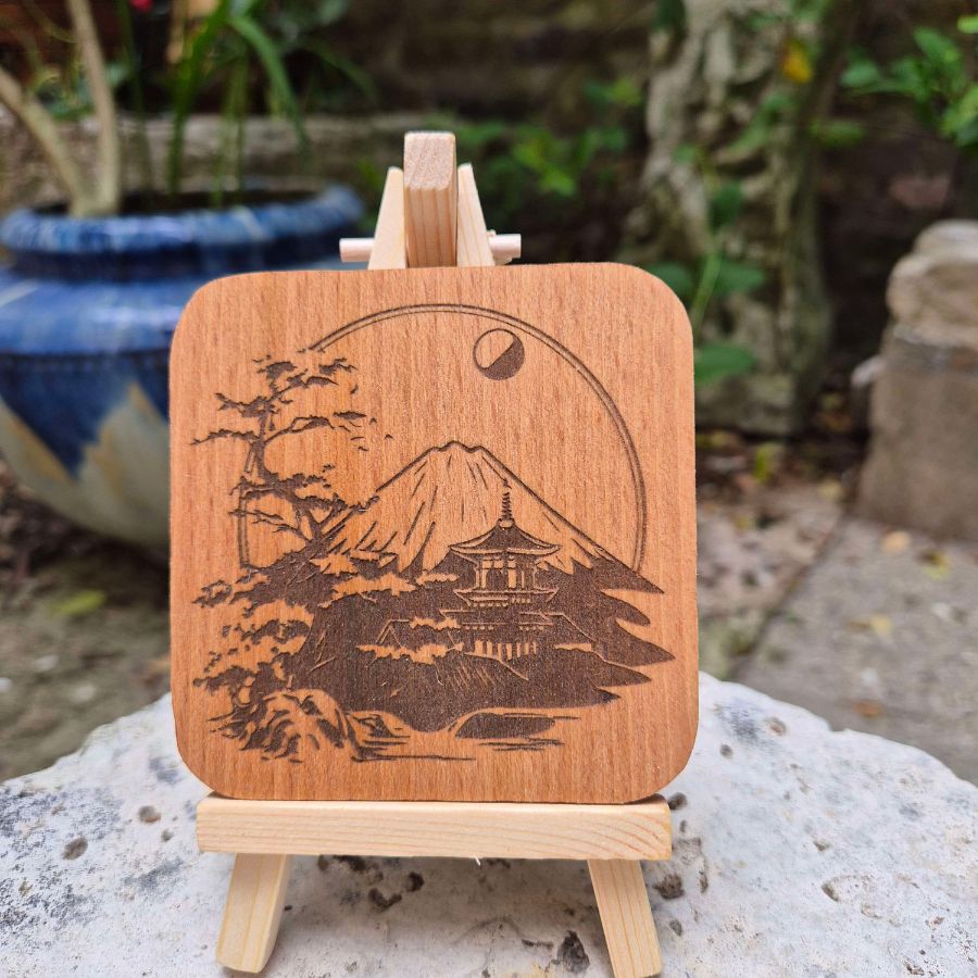 Ce sous-bock en bois s’inspire des paysages emblématiques du Japon, avec une illustration du Mont Fuji accompagnée d’un temple traditionnel et de végétation. Une scène apaisante, qui évoque les estampes japonaises et les paysages contemplatifs.
