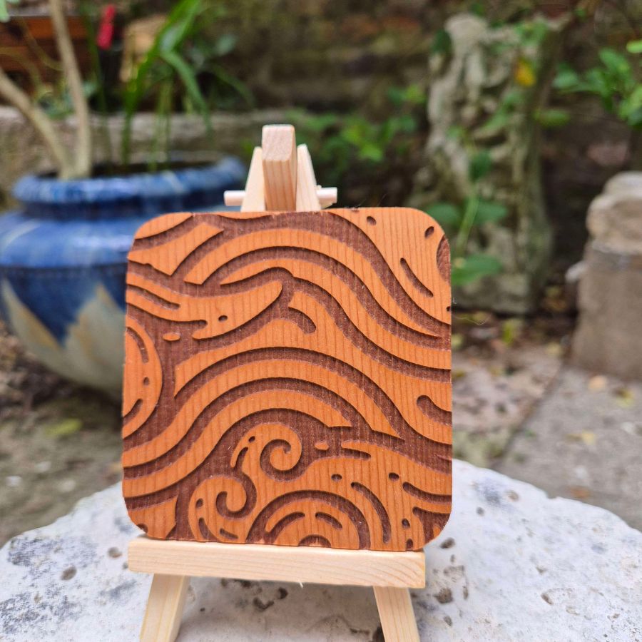 Ce sous-bock en bois présente un motif de nuages stylisés, inspiré de l’univers manga et des illustrations japonaises traditionnelles. Les formes arrondies et fluides créent une composition graphique douce et équilibrée.