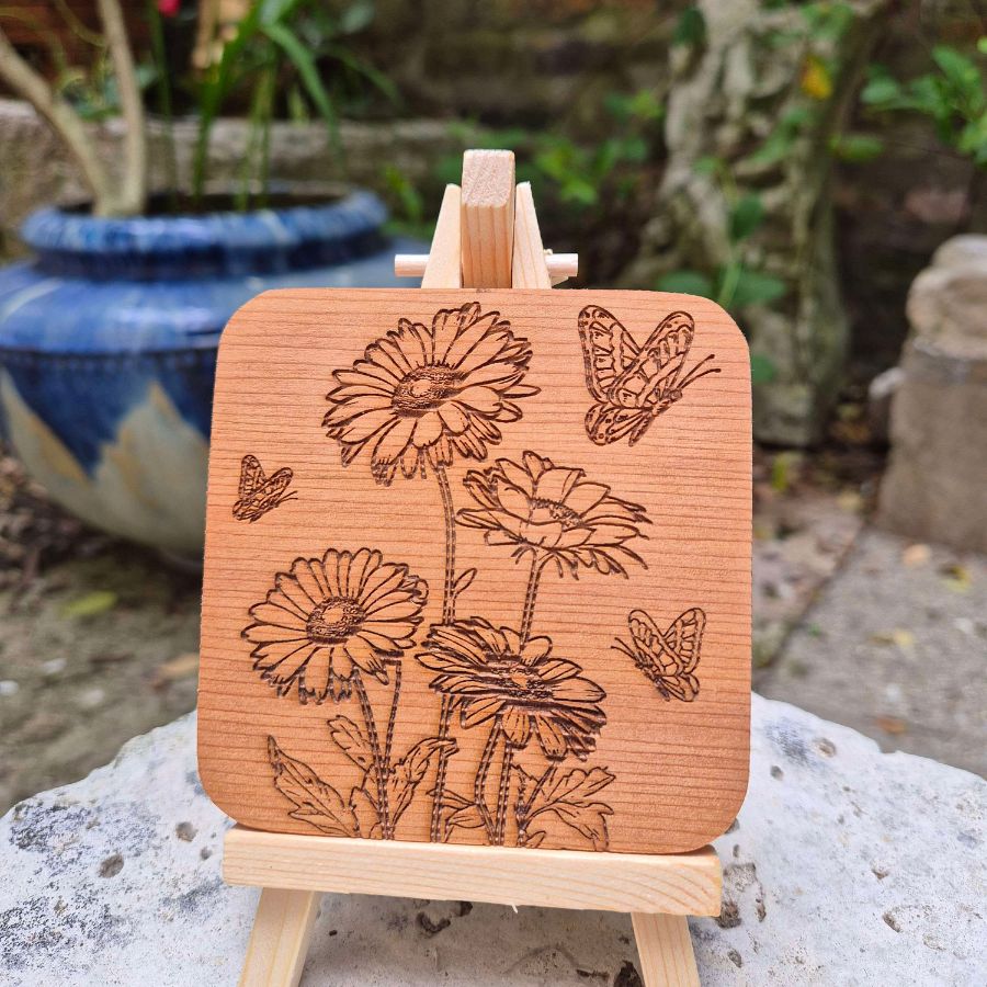 Ce sous-bock en bois met en scène des fleurs délicates accompagnées de papillons en vol. L’ensemble évoque un instant simple, presque printanier, avec une composition douce et équilibrée.