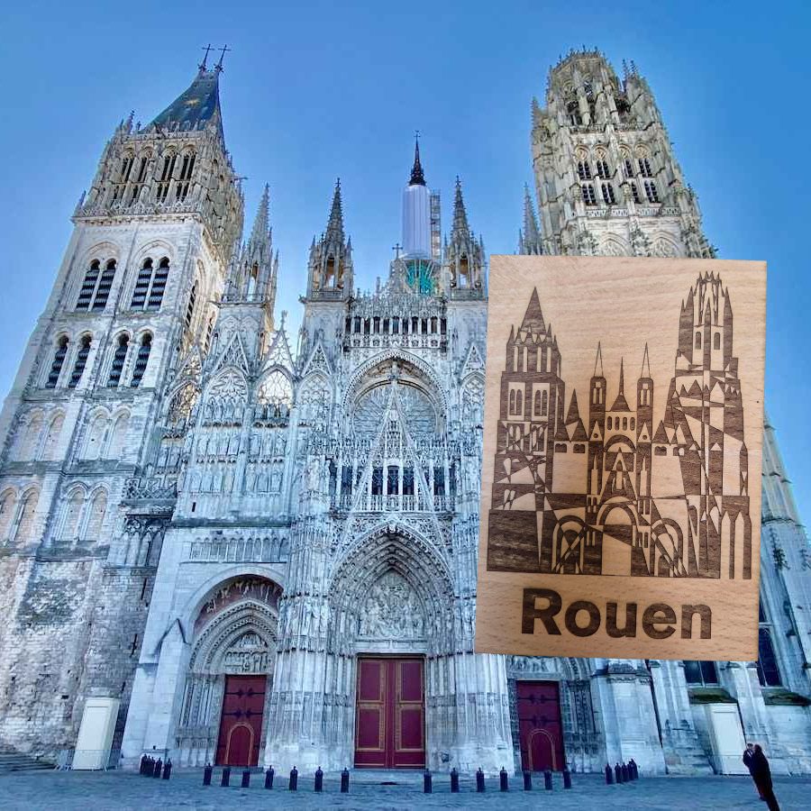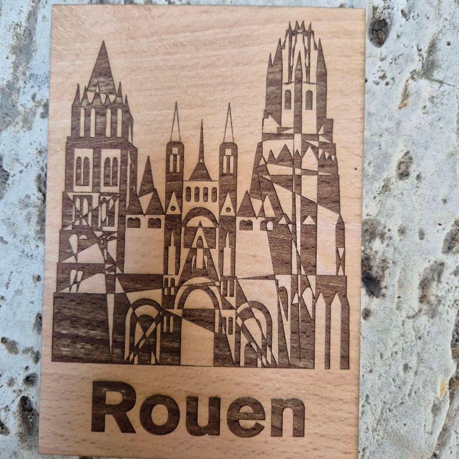 Fabriquée en bois naturel, elle apporte une vraie sensation de matière en main, loin des cartes classiques en papier. C’est à la fois un souvenir de Rouen, un petit objet déco ou une idée de cadeau simple mais originale.