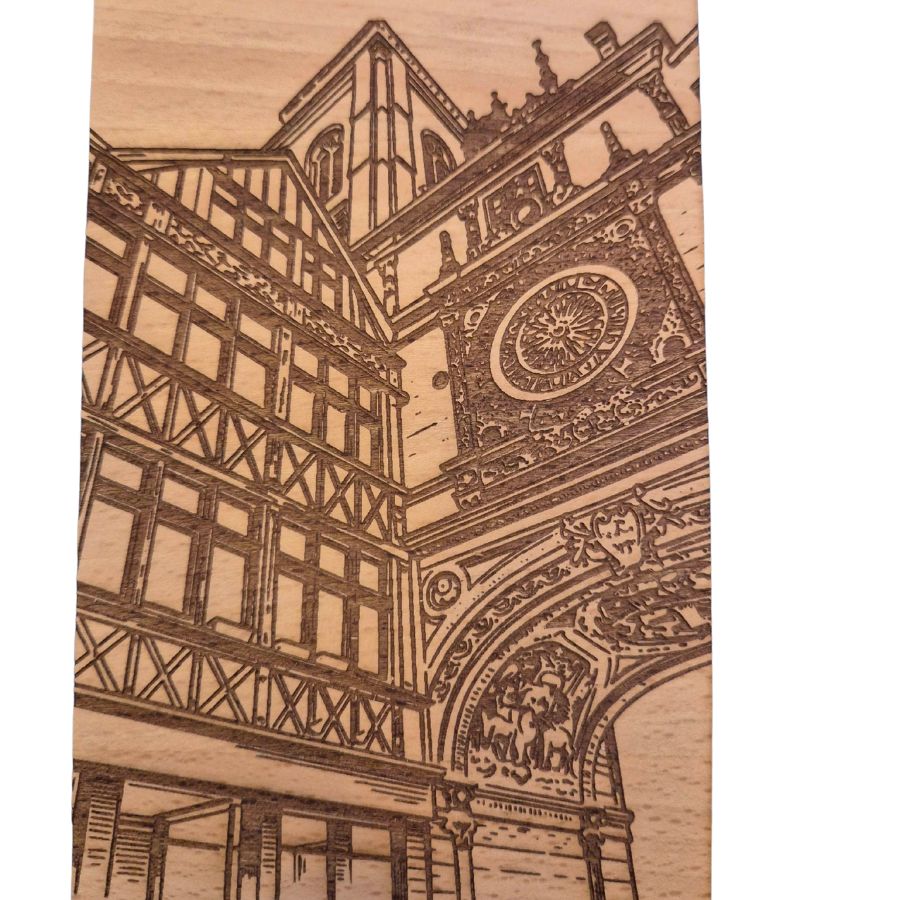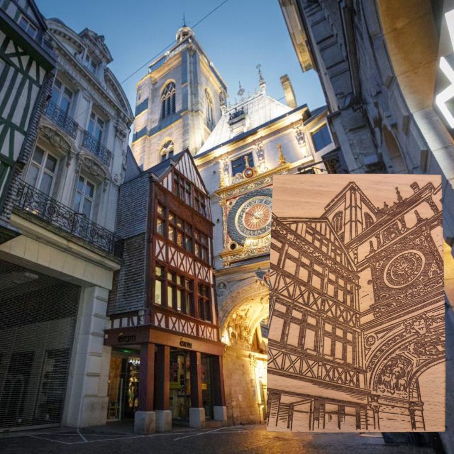 Cette carte postale en bois met en scène le Gros Horloge de Rouen, accompagné des façades à colombages typiques du centre historique. La gravure joue sur les perspectives et les détails pour faire ressortir toute la richesse architecturale du lieu, entre pierre sculptée et bois apparent.