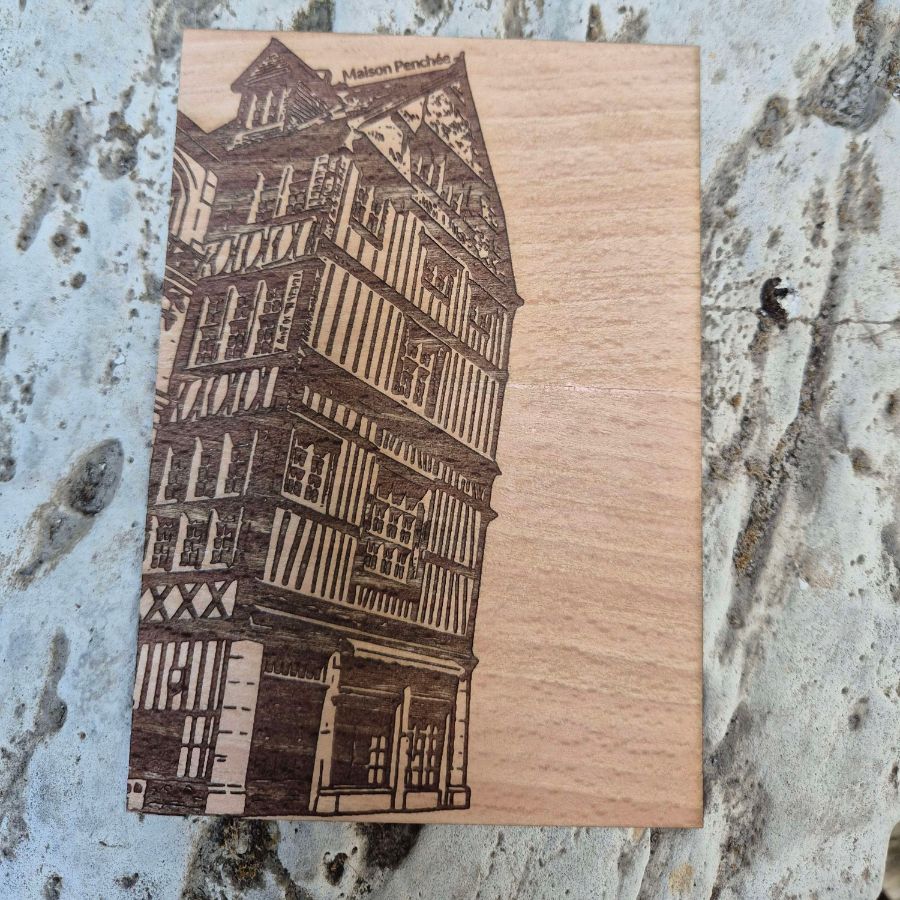 Cette carte postale en bois met en avant la célèbre Maison Penchée de Rouen, avec ses colombages typiques et son inclinaison qui attire tout de suite l’œil. La gravure souligne les lignes irrégulières et le charme un peu décalé de cette façade emblématique du centre historique.