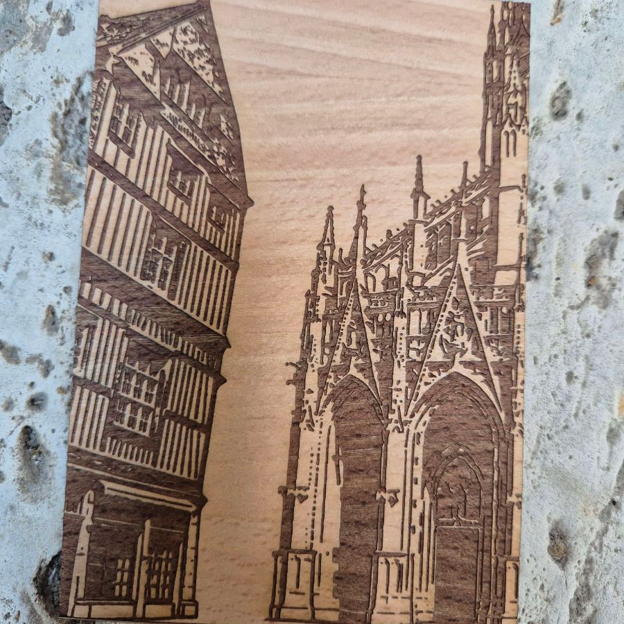 La gravure met en valeur les détails des façades et des arcs, avec un rendu précis directement marqué dans le bois. Chaque carte est réalisée en bois naturel, avec des variations de teinte qui rendent chaque exemplaire unique.